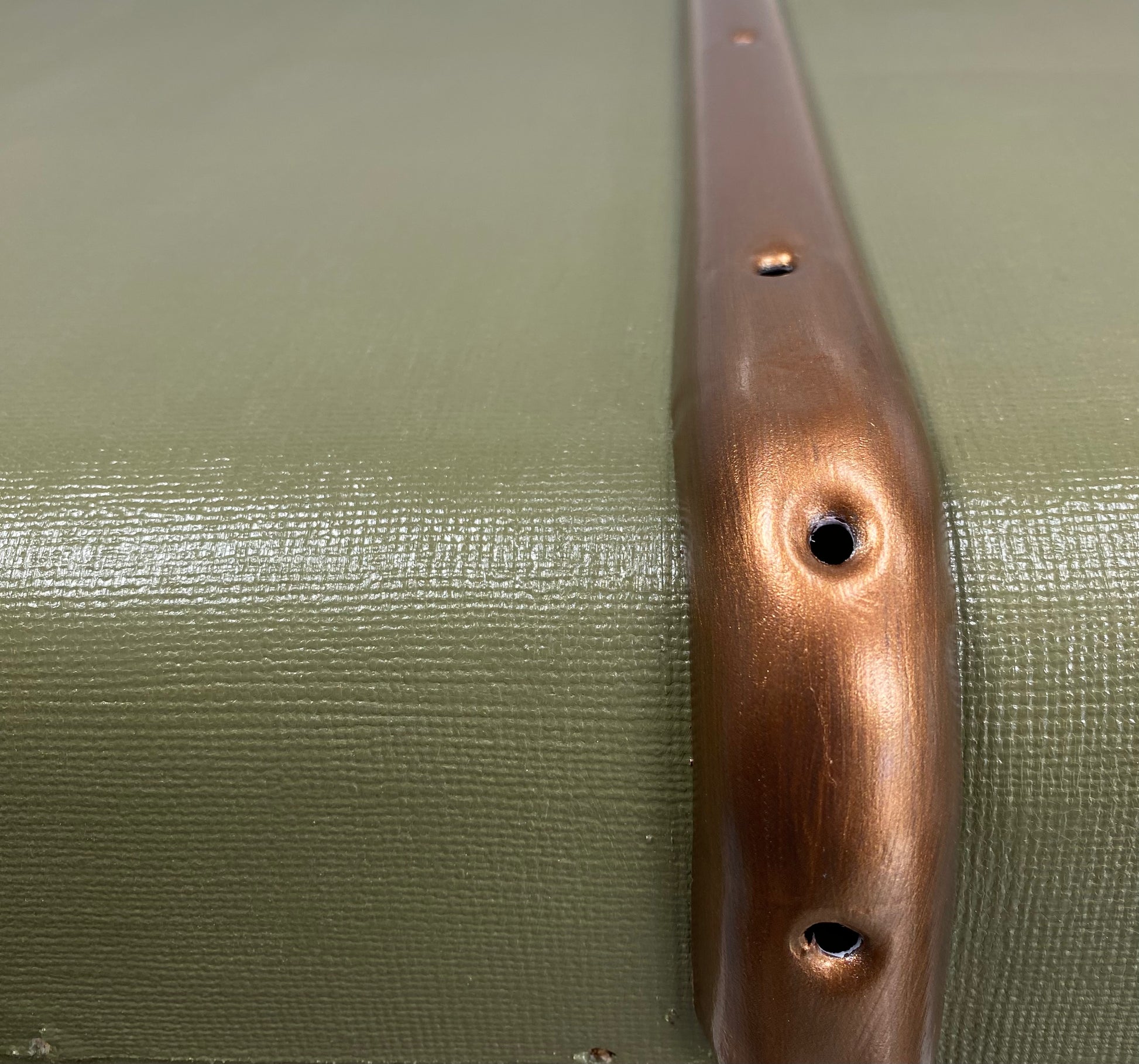 The body given a modern olive green silk finish, and the metalwork was finished in a beautiful aged copper. The seat features very firm upholstery foam wrapped in luxurious faux leather in Chestnut brown, and accented with three matching buttons to add that finishing touch.